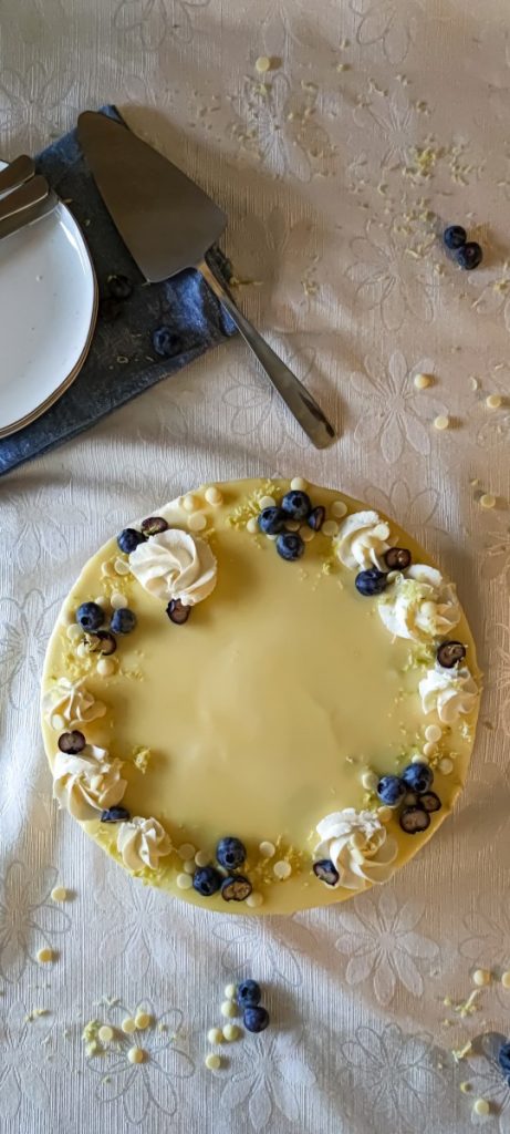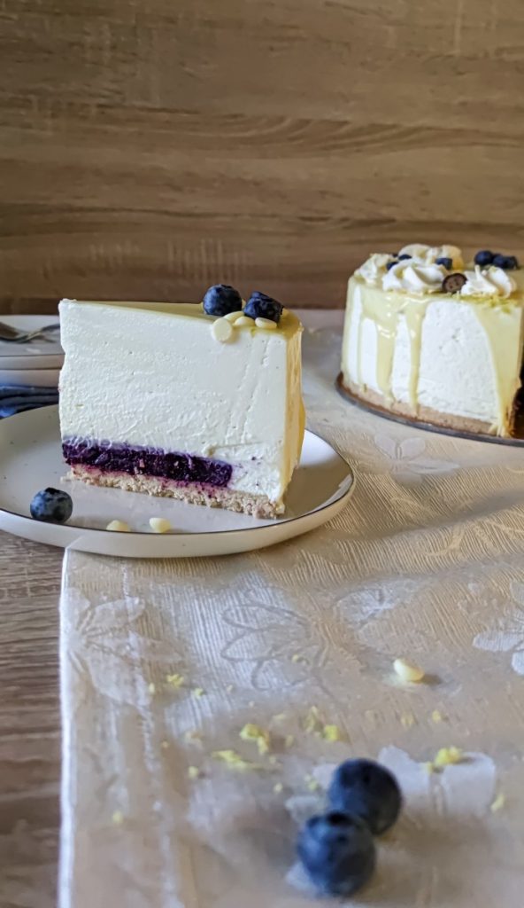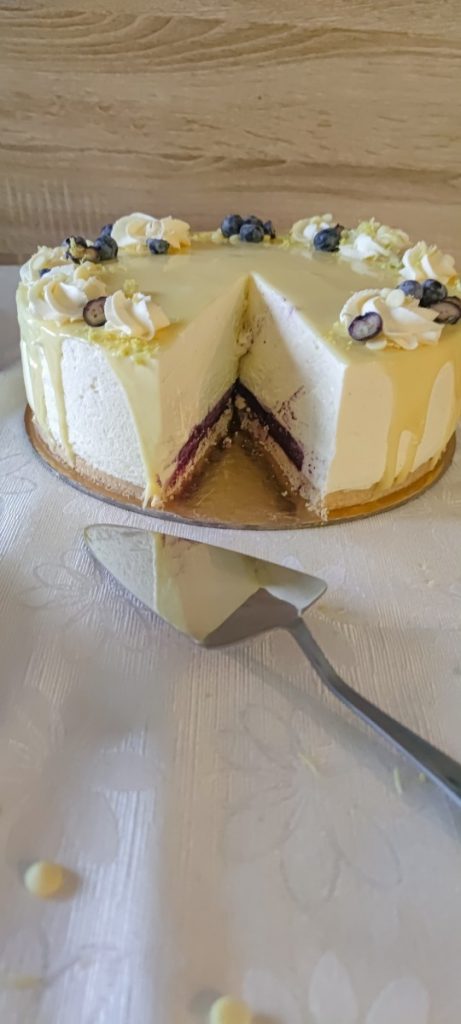 - Čez piškotno dno in borovničev žele, prelijemo kremo iz bele čokolade in jo lepo poravnamo. Lahko si pomagamo z lopatko za obračanje palačink.